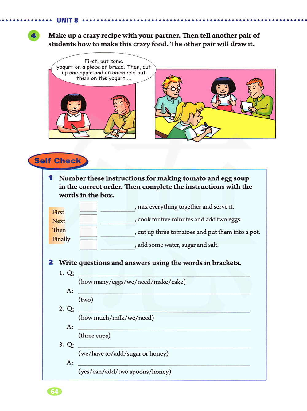 与你的伙伴编一个疯狂的食谱,然后告诉另一对学生如何去制作这一道疯狂的食物。另一对将画它。