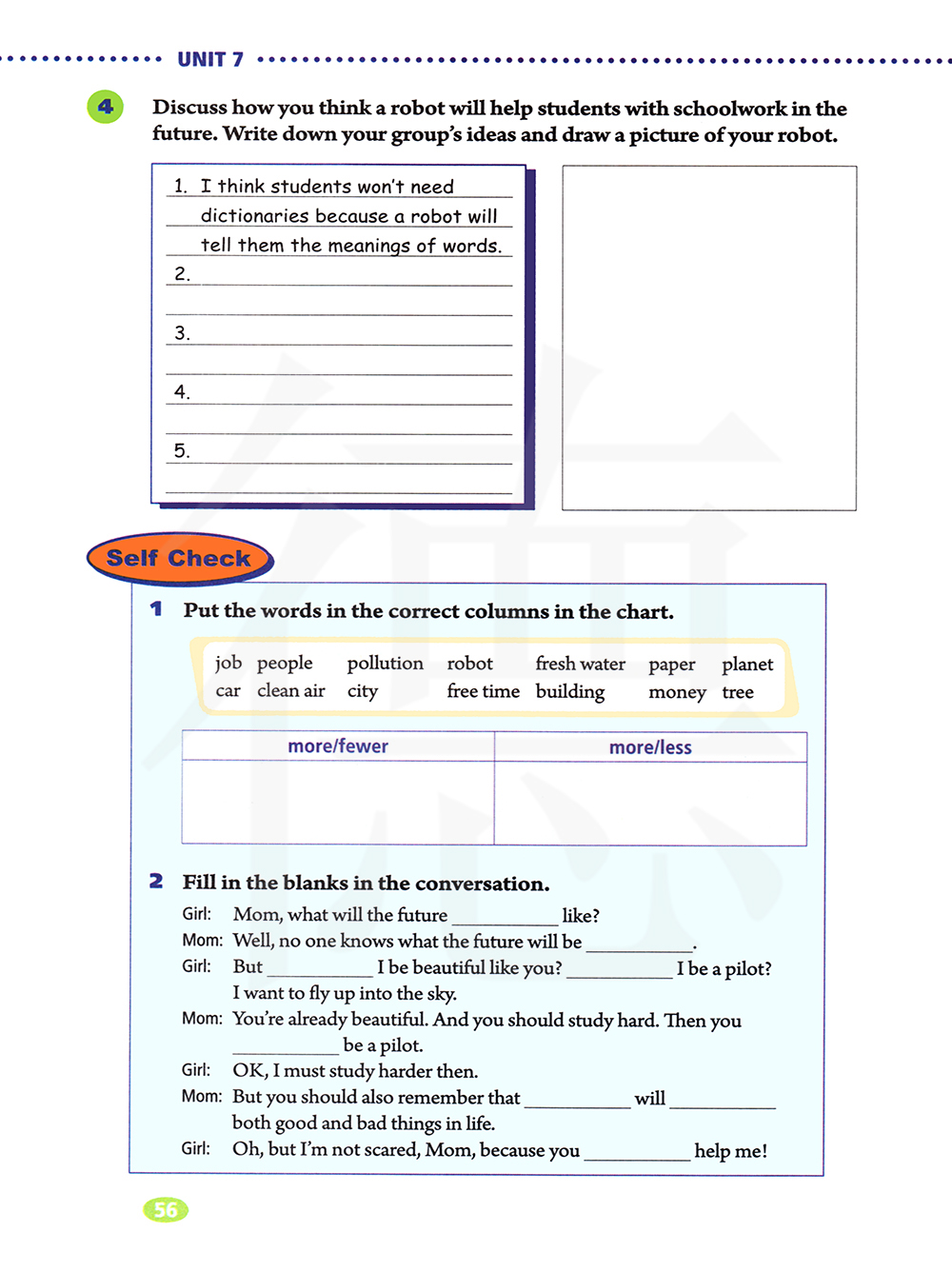 讨论你认为将来机器人怎样帮助学生学习功课,写下你小组的观点,并且画一张你机器人的图像。