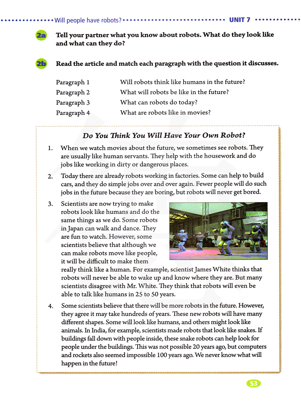 你认为你将会拥有自己的机器人吗? 在观看关于未来的电影时,我们有时会看见机器人。通常它们像人类的佣人。它 们帮着做家务,或者在肮脏或危险的地方干活。