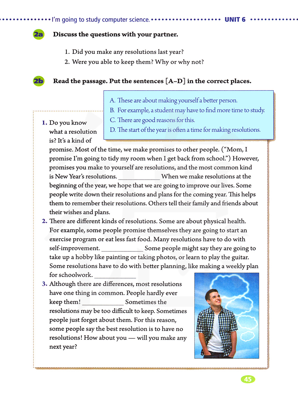 你知道决心是什么吗?决心就是一种承诺。很多时候 ,我们对他人许下承诺。 ( ((妈妈,我保证我从学校回来后立即整理自己的房间 。") 然而 ,你对自己 许下的承诺就叫做决心 。其中最常见的一种就是新年计划。一年的开始常常是制 定计划的时候 。我们在新年伊始制定计划时,希望我们的生活变得更好。有 人把 他们来年的打算和计划写下来 。这能帮助他们记住自己的计划。其他 人则把他们 的愿望和计划告诉家人和