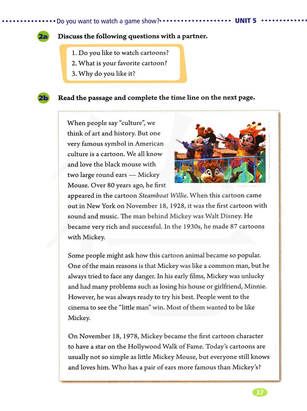 当人们说起"文化 " 这个词 ,我们(通常)会想到艺术和历史。但是在美国文化中有一个非常著名的象征,那就是 "卡通片 一对又大又圆的耳朵的黑色老鼠 一一米老鼠 。80 多年前,他第一次出现在卡通片《威利号汽船》中。这部卡通片 1928 年 11 月 28 日在纽约上映,成为第一部带有配 音和音乐的卡通片.米老鼠的幕后 之人便是沃尔特.迪斯尼 。后来他变得非常富有和成功 。在 20 世纪 30 年代