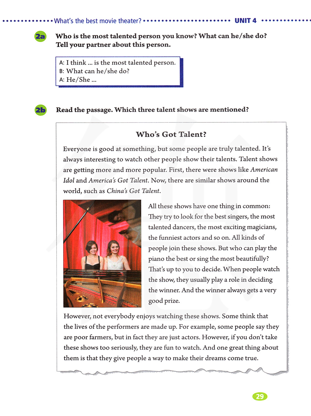 所有的节目都有一 个共同点 :他们试图找到最好的歌 手、最有天赋的舞者 、最令人激动的魔术师、最滑稽的演员 等等。各种各样的人都可以参加这个节目。但谁 钢琴谈得最好?谁唱歌唱得最优美?那有你自己来决定 。人们看这类节目的时候,通常承担着评判优胜者的角色 。而且,获胜者总是能得到丰厚的奖赏。