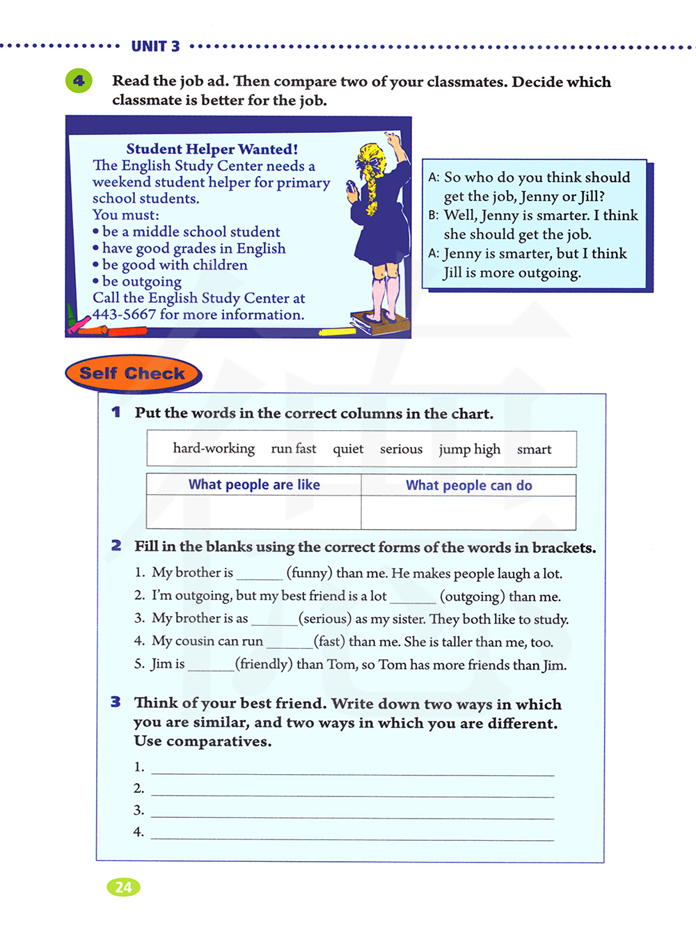 想想你最好的朋友,写下你们相似的两方面,和你们不同的两方面,使用比较级