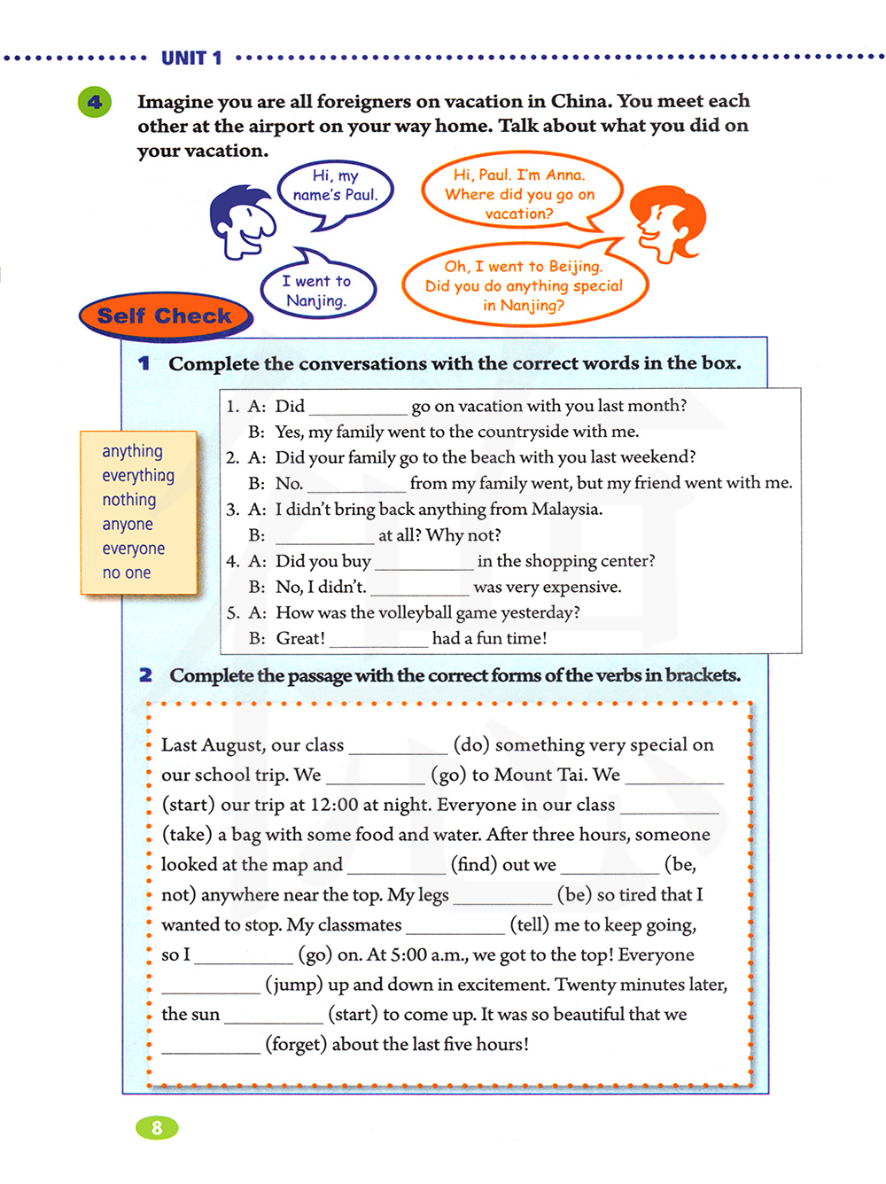 想象你们都是来中国度假的外国人,在回家的路上,你们在机场互相遇见,谈论你们在假期做了什么。