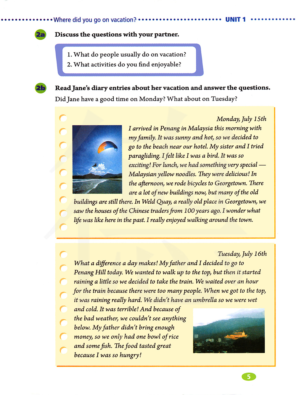 今天早上我和家人抵达马来西亚槟城。天气晴朗炎热,于是我们决定去宾馆附的海滩。我和姐姐尝试了滑翔伞运动,我感觉自己就像一只鸟。这太令人兴奋了!午饭我们吃了非常特殊的东西——马来黄面,可真是好吃呀!下午,我们骑自行车去了乔治市。如今那里有许多新的建筑,但是许多老房子依然还在。在乔治市的一处古老的地方——海墘街,我们看到了一百年前中国商人们的房子。我在想这里过去的生活是什么样子呢。漫步在乔治市真是很享受