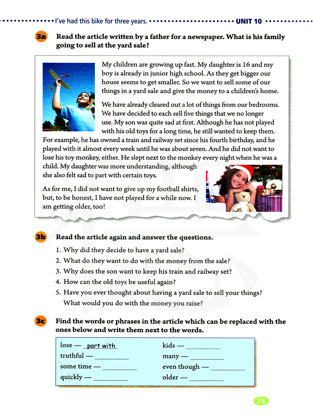 我的孩子们在迅速地成长。女儿今年16岁了,儿子已经在读初中了。由于他们长大了,我们的房子似乎就变小了。因此我们想在庭院拍卖上卖掉我们的一些东西,然后把所得的钱款捐给儿童之家。