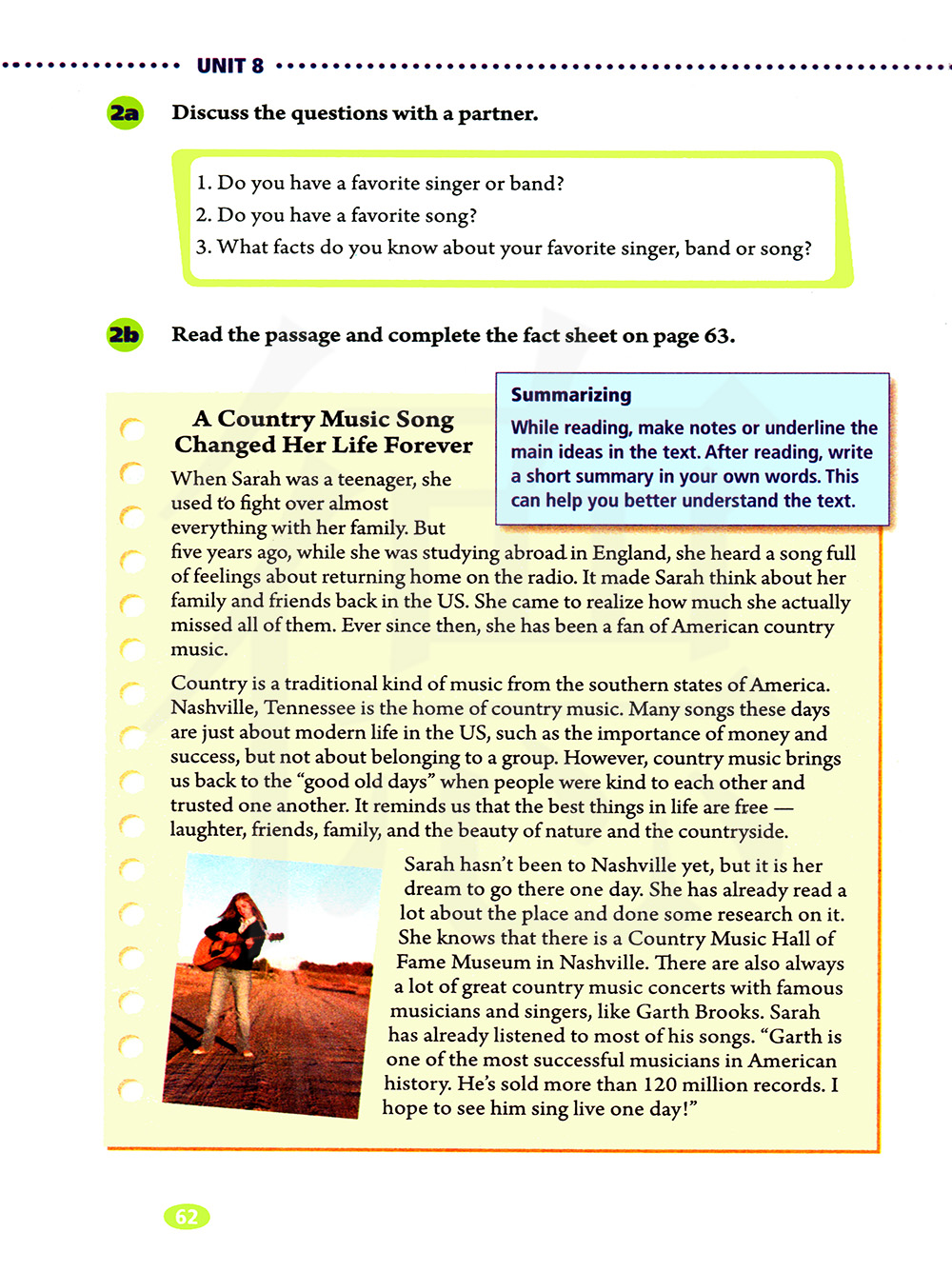 萨拉(Sarah)没有回到纳什维尔,但是她希望有一天能够去那儿。她已经读很多关于这个地方的书籍,做了这个地方的很多研究。她知道,在纳什维尔有乡村音乐名人堂博物馆。也有很多著名音乐家和歌唱家在那里举行很多音乐演唱会,比如像加思?布鲁克斯。萨拉已经听过加思.布鲁克斯的多数歌曲。“加布.鲁克斯是美国音乐史上最成功的音乐家之一,他的专辑出售超过120,000,000张。我希望有一天能够见到他唱歌生活!”。