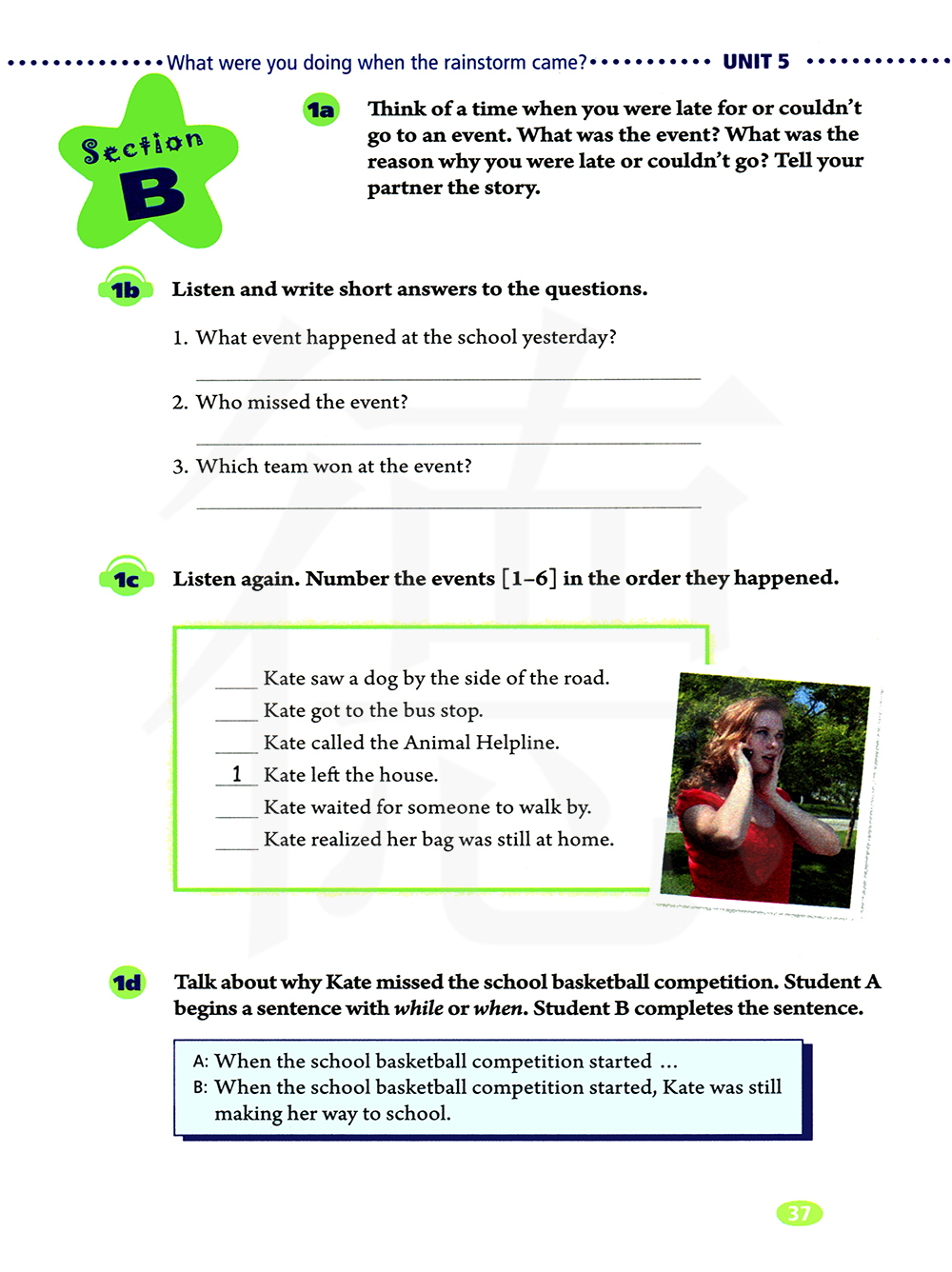 说一说为什么凯特错过了学校的篮球比赛,学生A用while或when开头对话,学生B完成对话。