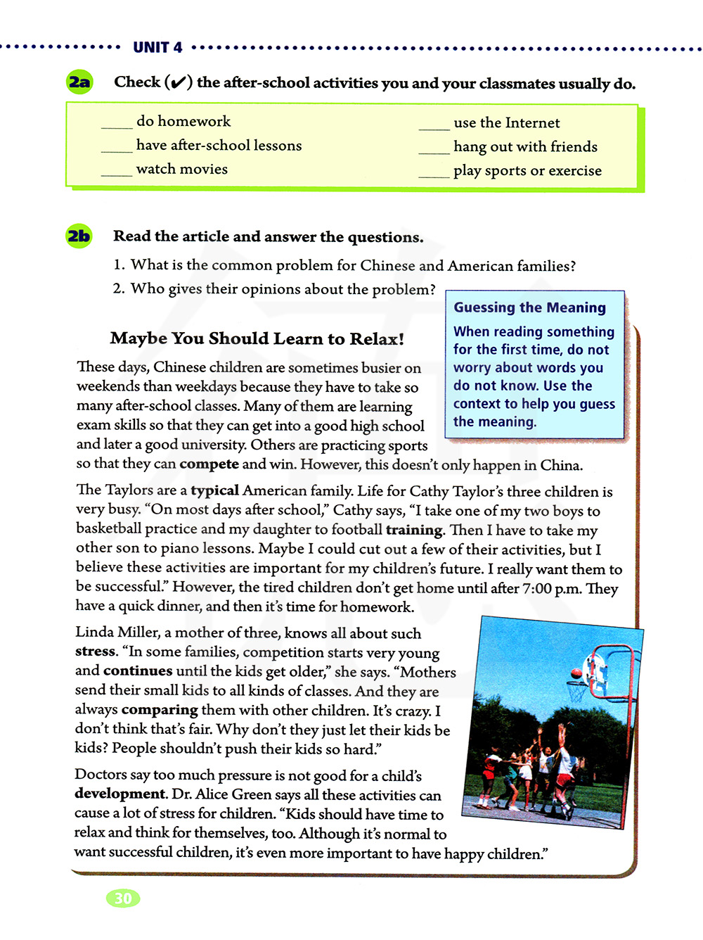 泰勒一家是一个典型的美国家庭。对于凯茜?泰勒的三个孩子来说,生活是忙碌的。“在大多数日子的放学后”,凯茜说:“我送我的两个男孩子中的一个去进行篮球练习,送我的女儿去进行足球训练。然后我得送我的另一个儿子去上钢琴课。或许我可以舍弃(放弃)他们的几个活动,但是我相信这些活动对我孩子们的将来是重要的。我真想要他们成功。”然后,疲惫的孩子们直到晚上7点才到家。他们匆忙地吃完饭,接着就该做家庭作业了。