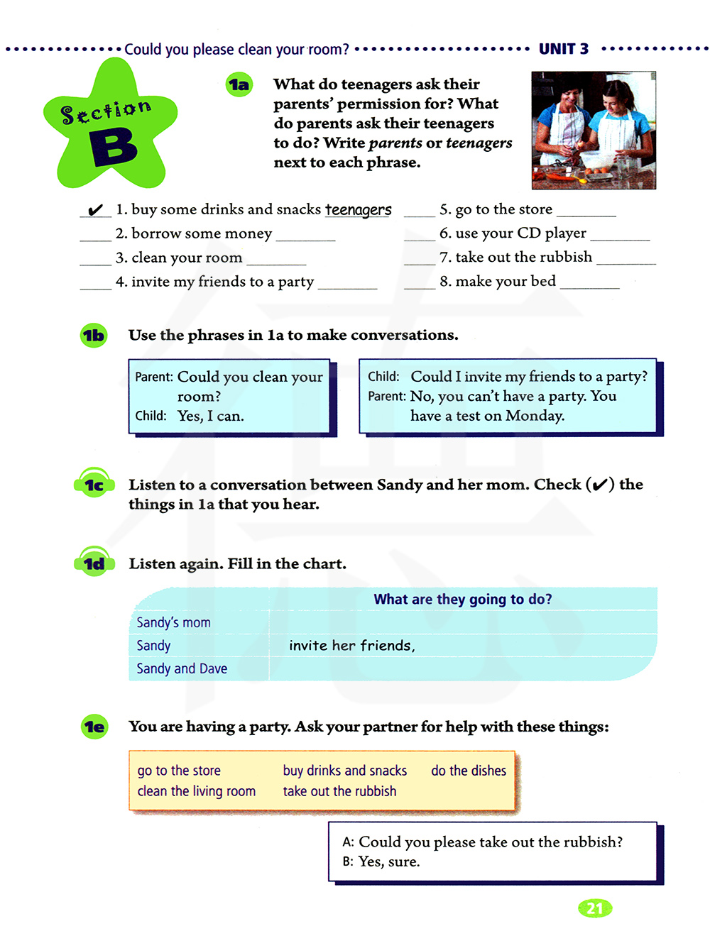 听一听桑迪和她妈妈之间的对话。在1a中勾出你所听到的事情。