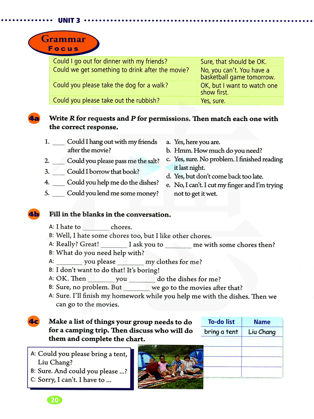 制作一份你们去野营的任务清单。然后谈论谁去做这些事,完成表格。