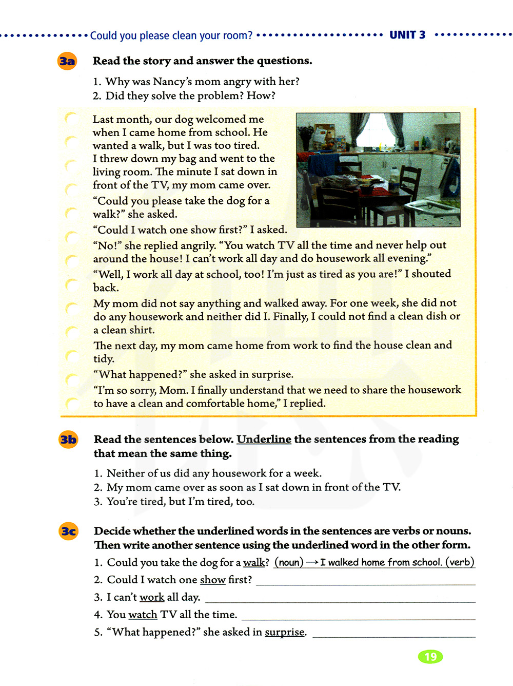 “我能先看个节目吗?”我问。 “不行!”她生气地答道。“你总是看电视,在家里从不帮忙!我不能整天工作,整晚还做家务。”