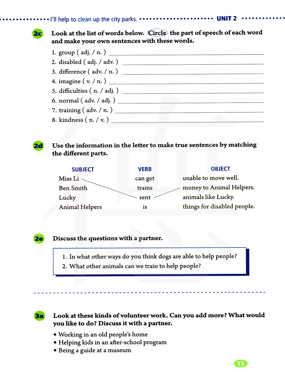 看一看这些志愿工作。你还能增加更多的吗?你想要做什么?和你的同伴讨论一下。