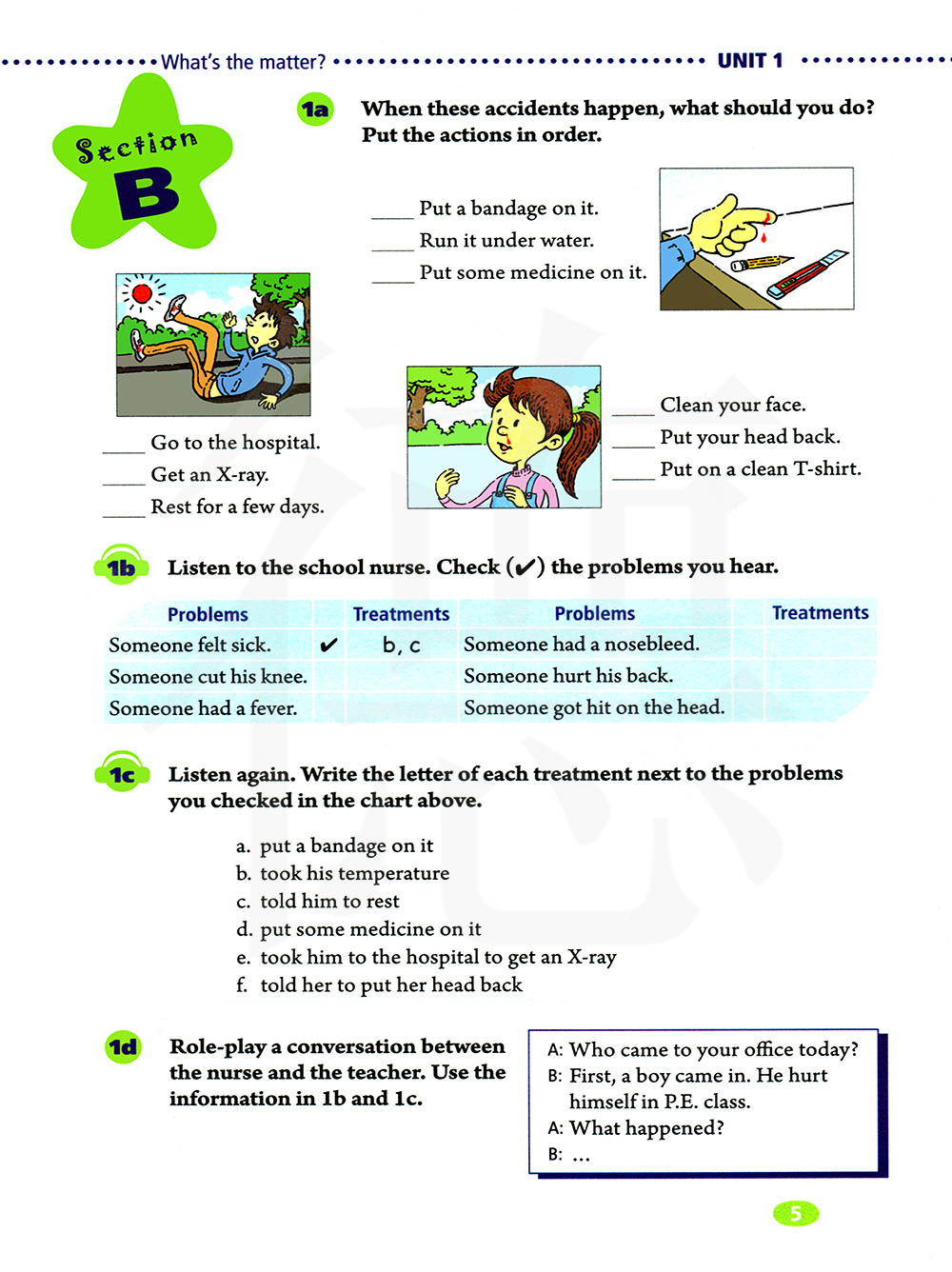 角色扮演护士和老师之间的对话,利用1b和1c中的内容。