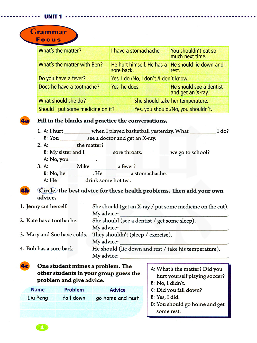 她应该做什么? 她应该量体温。 我应该擦一些药在上面吗? 是的,你应该/不,你不应该。