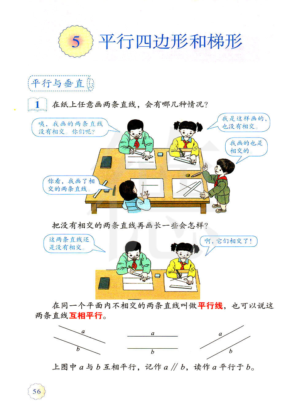 1、在同一平面内不相交的两条直线叫做平行线,也可以说这两条直线互相平行。