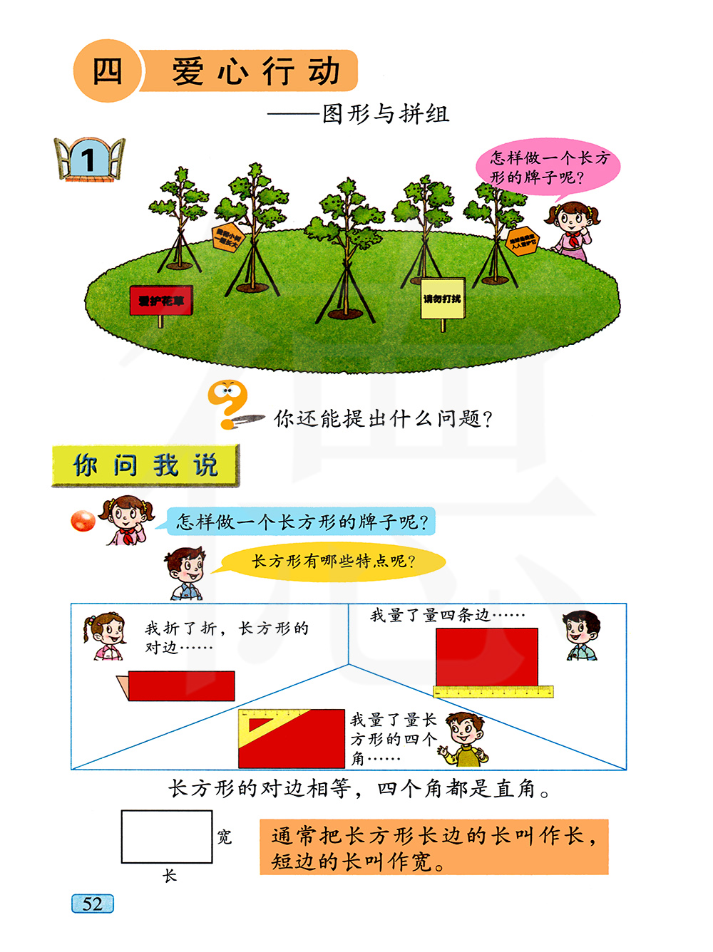 2:通常把长方形长边的长叫做长,短边的长叫做宽。