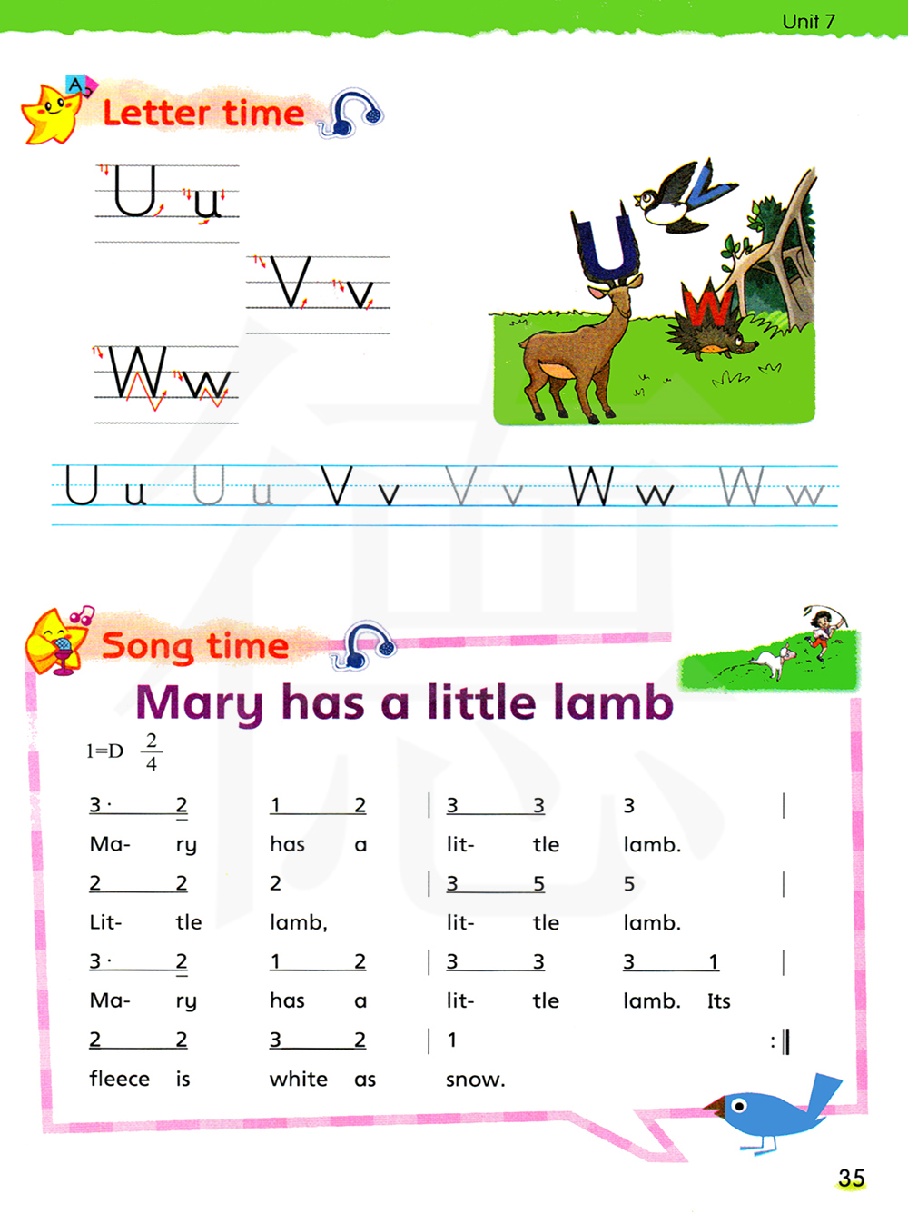 玛丽有一只小羔羊。小羔羊,小羔羊。玛丽有一只小羔羊。 她的毛像雪一样白。