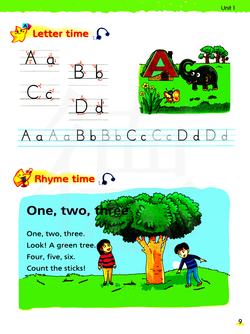 一,二,三。看!一颗绿色的树。四,五,六。数一数棍子。