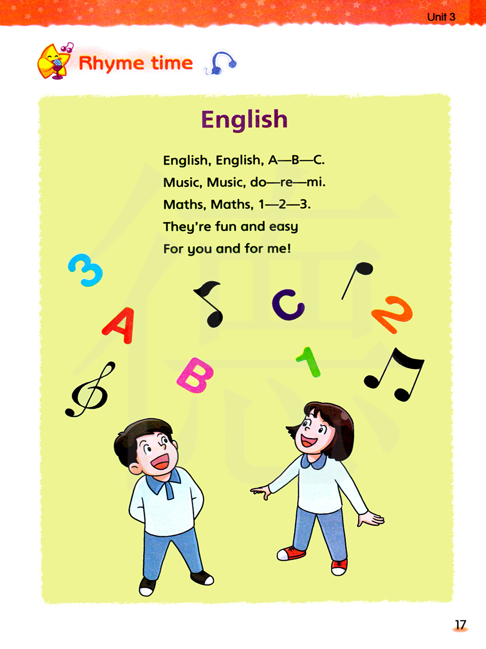 英语,英语,A---B-----C。 音乐,音乐,哆----唻----咪。数学, 数学,1----2----3。对你和我来说 它们既有趣又简单。