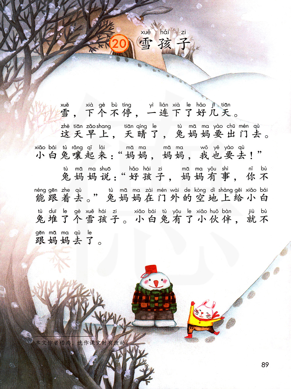 文章讲述了冬天的白兔妈妈准备出门去找萝卜时,小白兔吵嚷着也要去,兔妈妈堆了一个雪孩子陪他玩。后来,小白兔睡觉时,火烧着了小白兔的房子,雪孩子为救小