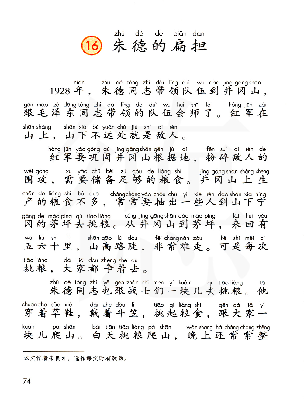 2、主要内容朱德身为红军总司令,却和普通官兵一起劳动。官兵们照顾他年纪大,不想让他参加劳动,于是把他挑东西用的扁担藏了起来。于是朱总司令又重新做了一根扁担,还写上“朱德扁担”的字样,不让别人再拿走。