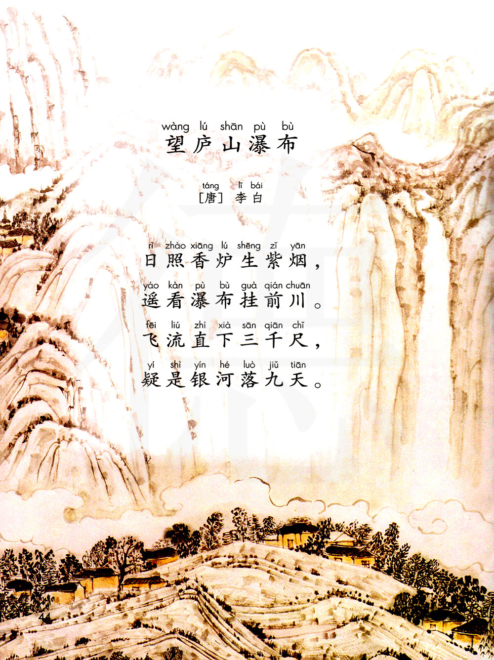 诗是七言绝句。运用了比喻夸张的手法。此诗中的香炉,即第一首诗开头提到的香炉峰,“在庐山西北,其峰尖圆,烟云聚散,如博山香炉之状”(乐史《太平寰宇记》)。可是,到了诗人李白的笔下,便成了另一番景象:一座顶天立地的香炉,冉冉地升起了团团白烟,缥缈于青山蓝天之间,在红日的照射下化成一片紫色的云霞。这不仅把香炉峰渲染得更美,而且富有浪漫主义色彩,为不寻常的瀑布创造了不寻常的背景。接着诗人才把视线移向山壁上的瀑布。“遥看瀑布挂前川”,前四字是点题。“挂前川”,这是“望”的第一眼形象,瀑布像是一条巨大的白练高挂于山川之间。“挂”字很妙,它化动为静,惟妙惟肖地表现出倾泻的瀑布在“遥看”中的形象。第一首诗说,“壮哉造化功!”正是这“造化”才能将这巨物“挂”起来,所以这“挂”字也包含着诗人对大自然的神奇伟力的赞颂。第三句又极写瀑布的动态。“飞流直下三千尺”,一笔挥洒,字字铿锵有力。“飞”字,把瀑布喷涌而出的景象描绘得极为生动;“直下”,既写出山之高峻陡峭,又可以见出水流之急,那高空直落,势不可挡之状如在眼前。然而,诗人犹嫌未足,接着又写上一句“疑是银河落九天”,真是想落天外,惊人魂魄。“疑是”值得细味,诗人明明说得恍恍惚惚,而读者也明知不是,但是又都觉得只有这样写,才更为生动、逼真,其奥妙就在于诗人前面的描写中已经孕育了这一形象。