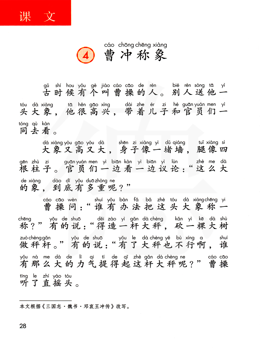 1:本文讲的是曹操的儿子曹冲小时候动脑筋想出了称大象的办法的故事。一个七岁的孩子,想出称象的办法比官员强,比官员妙,这实在难能可贵。曹冲称象的故事,因此广为流传;曹冲爱动脑筋,善于观察,富于联想的品质,值得我们认真借鉴。