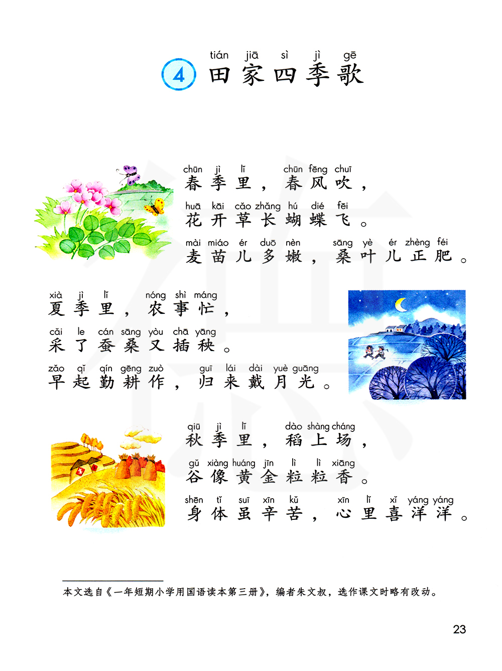 同学们,田家的四季是美丽的,是迷人的,我国古代有很多大诗人也曾讴歌赞美过四季呢,