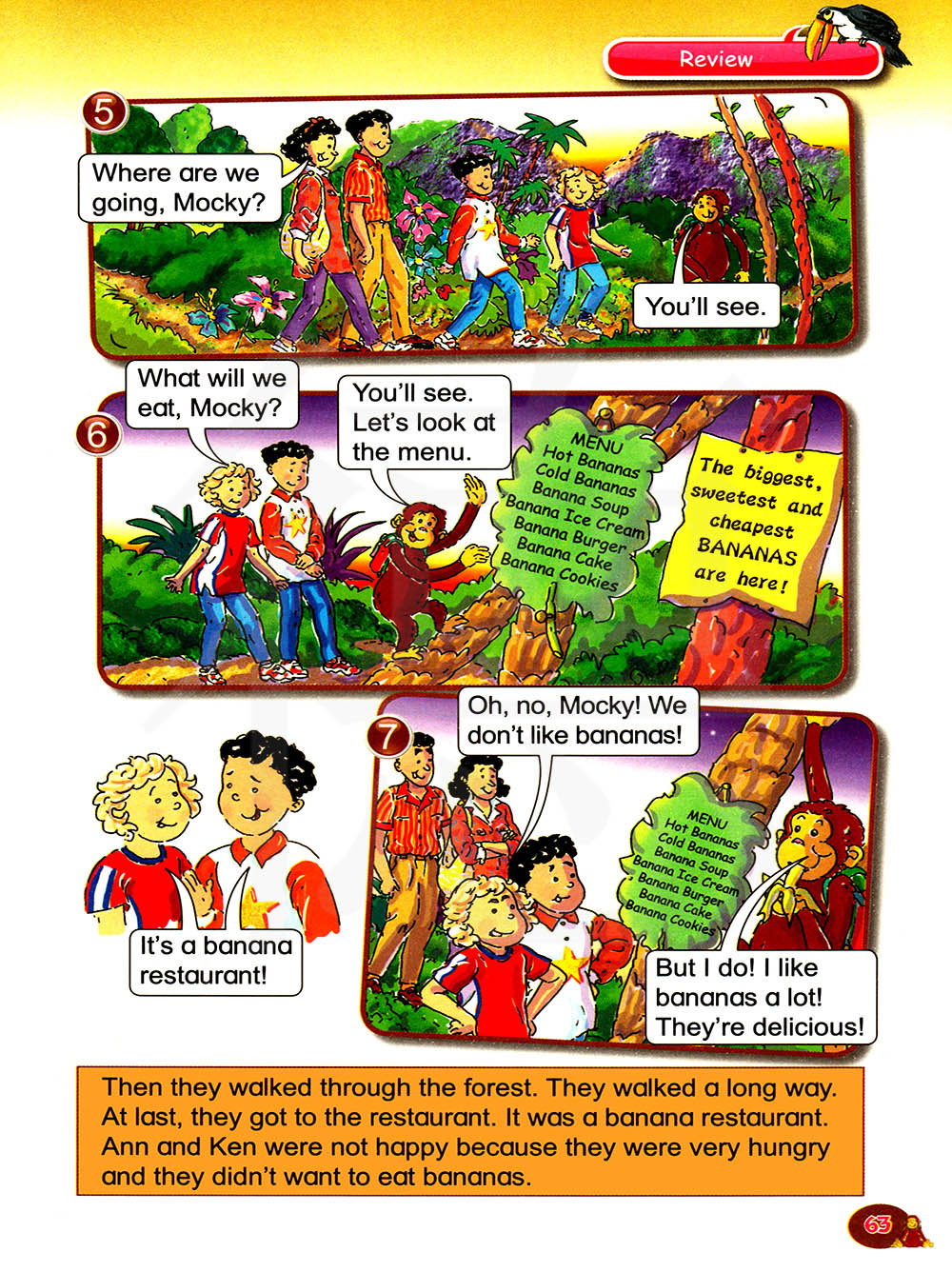 然后他们步行穿过森林。他们走了很长一段路。然后,他们走进一家餐馆。那是一家香蕉餐馆。安和肯很不开心因为他们很饿而且他们不想吃香蕉