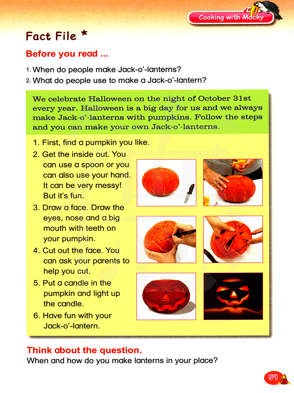 我们在每年的十月三十一日晚上庆祝万圣节前夕。万圣节前夕对于我们来说是一个重要的日子,而且我们总是用南瓜来做南瓜灯。按照下面的步骤,你就能制作你自己的南瓜灯了。