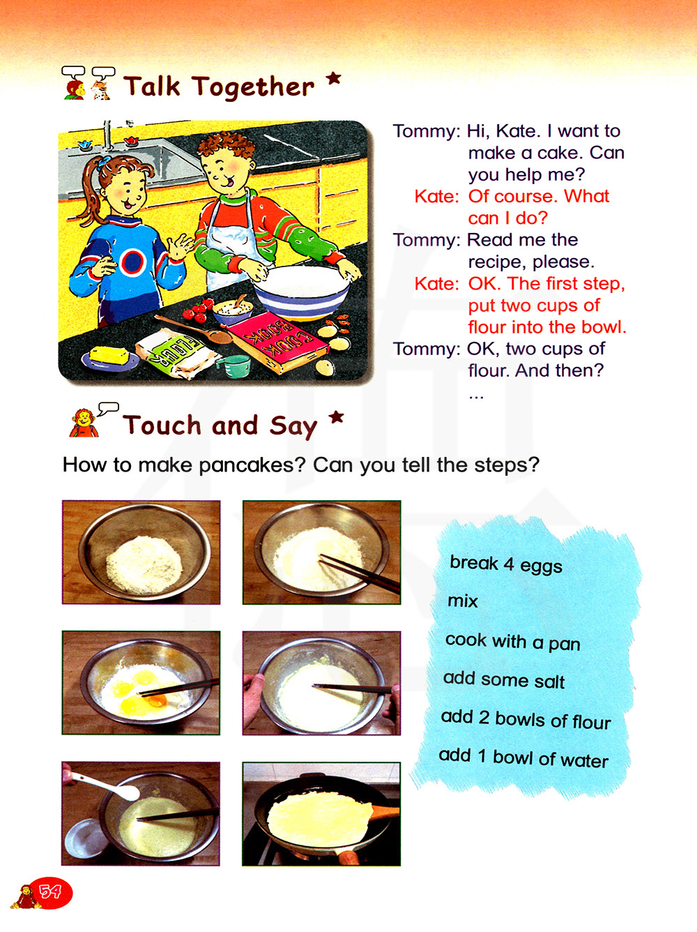 请把食谱给我读一遍。 好的,第一步,把两杯面粉放进碗里。