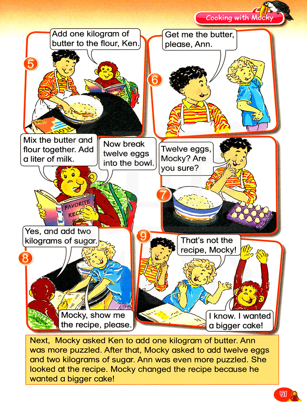 接着,莫基要肯加入一公斤的黄油,安更困惑了。之后,莫基要求加入12个鸡蛋和两公斤的糖,安更困惑了。她看了看食谱。莫基改变了食谱因为他想要一个更大的蛋糕