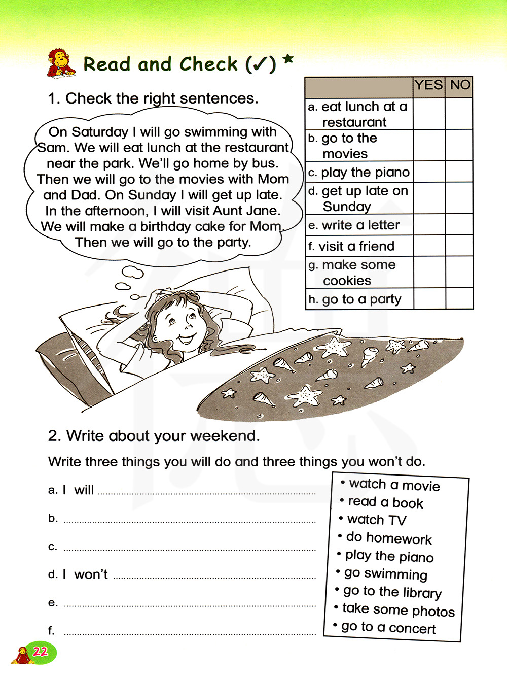 周六我会和山姆一起去游泳。我们会去邻近公园的饭店吃午餐。我们会坐巴士回家,然后和爸爸妈妈去看电影。周日我将会晚点起床。下午,我将会拜访简阿姨。我们会为妈妈做一个生日蛋糕,然后我们去参加晚会。