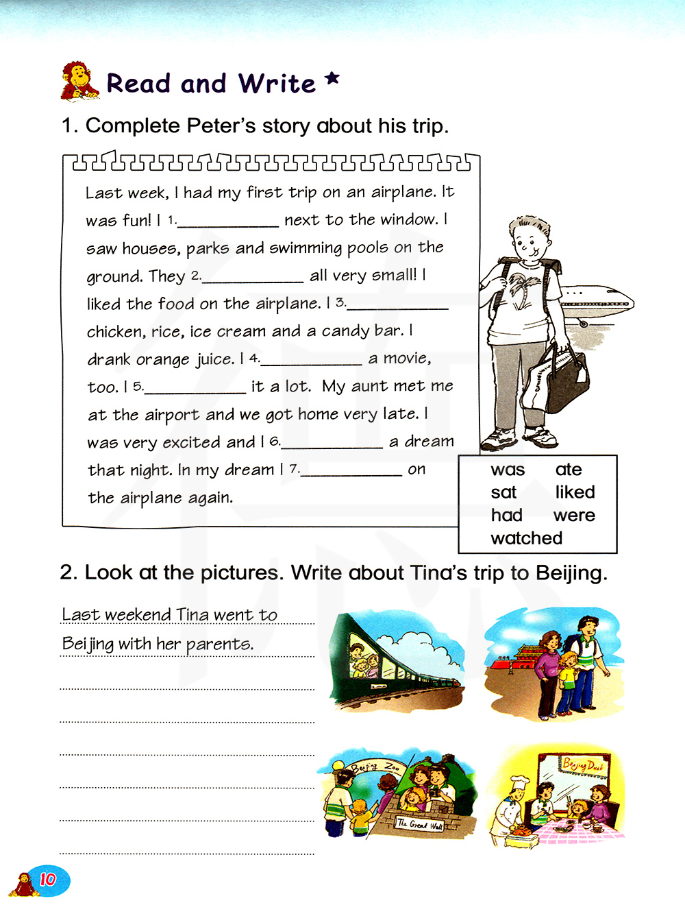 上周,我第一次乘飞机旅行。太有趣了,我坐在靠窗户的位置。我看见了地面上的房子,公园,和游泳池,它们都非常小。我喜欢飞机上的食物,我吃了鸡肉,米饭,冰激凌和一根糖果棒。我喝了果汁,我还看了一部电影。我很喜欢,我的姑妈到机场接我,我们很晚才到家。我非常兴奋。那晚我做了一个梦,梦里我又一次坐到飞机上