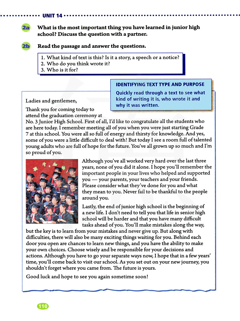 虽然在过去三年时光里你们都非常努力学习, 但你们都不是单 枪匹马作战。我希望你们记住所有出现在你们生命中的重要人—— 父母,老师还有朋友, 他们都帮助和支持过你们。 请认真想想 他们为你们做过什么,他们对你来说意味着什么。永远不要忘记 对你身边的人心存感恩之情。