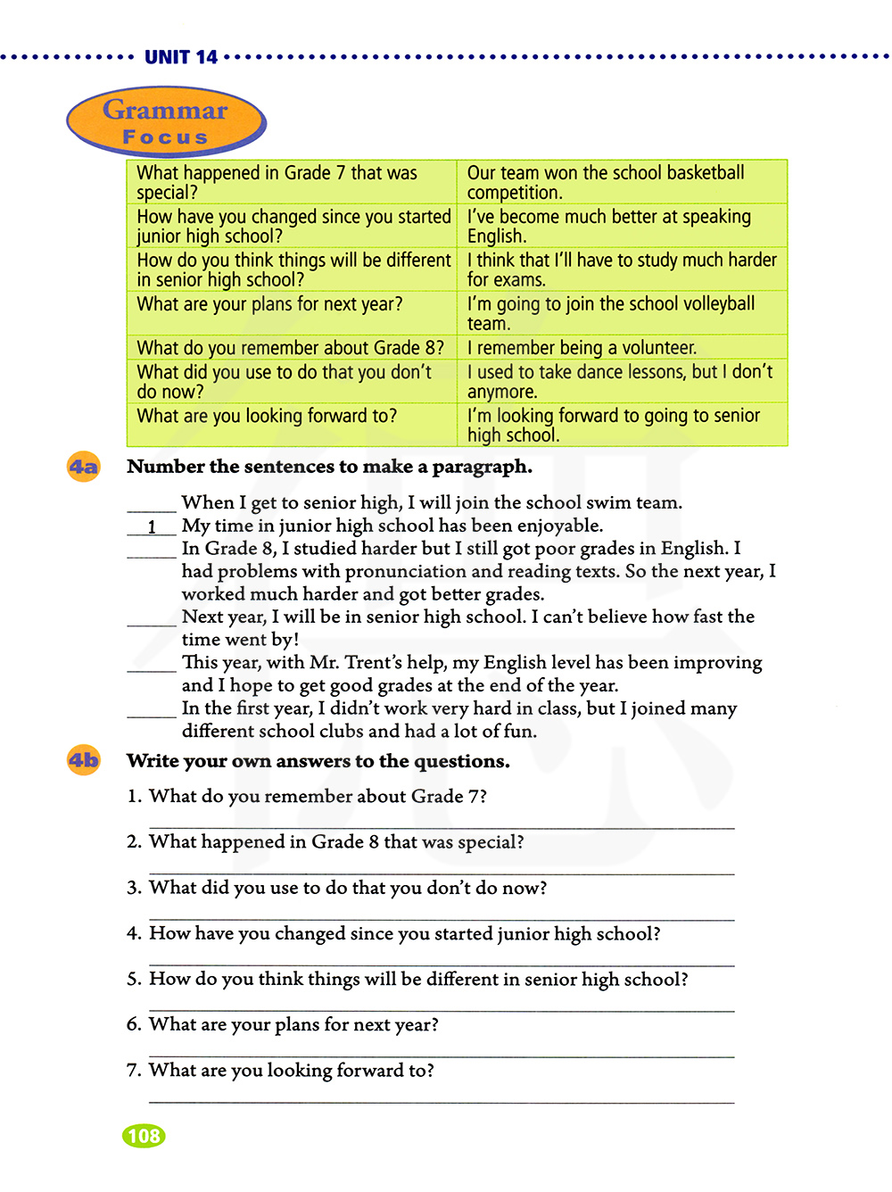 在7年级时发生了什么特别的事情?我们队赢得了学校篮球比赛。 自从你上初中发生了怎么的变化?我变得更擅长说英语。
