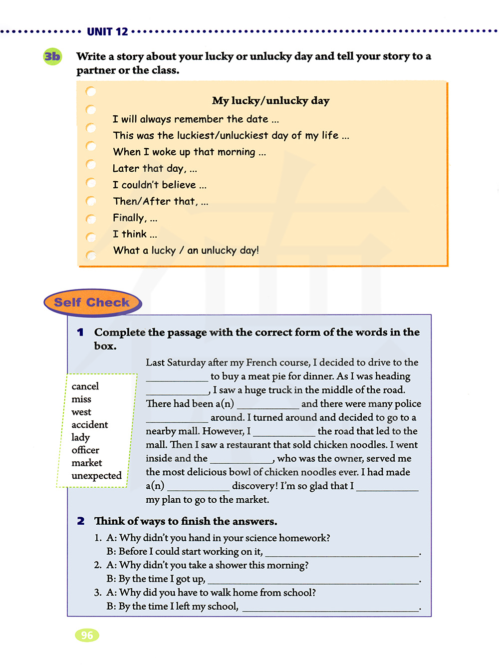 就你幸运或不幸运的一天写一个故事,将你的故事告诉你的同伴或班上同学。