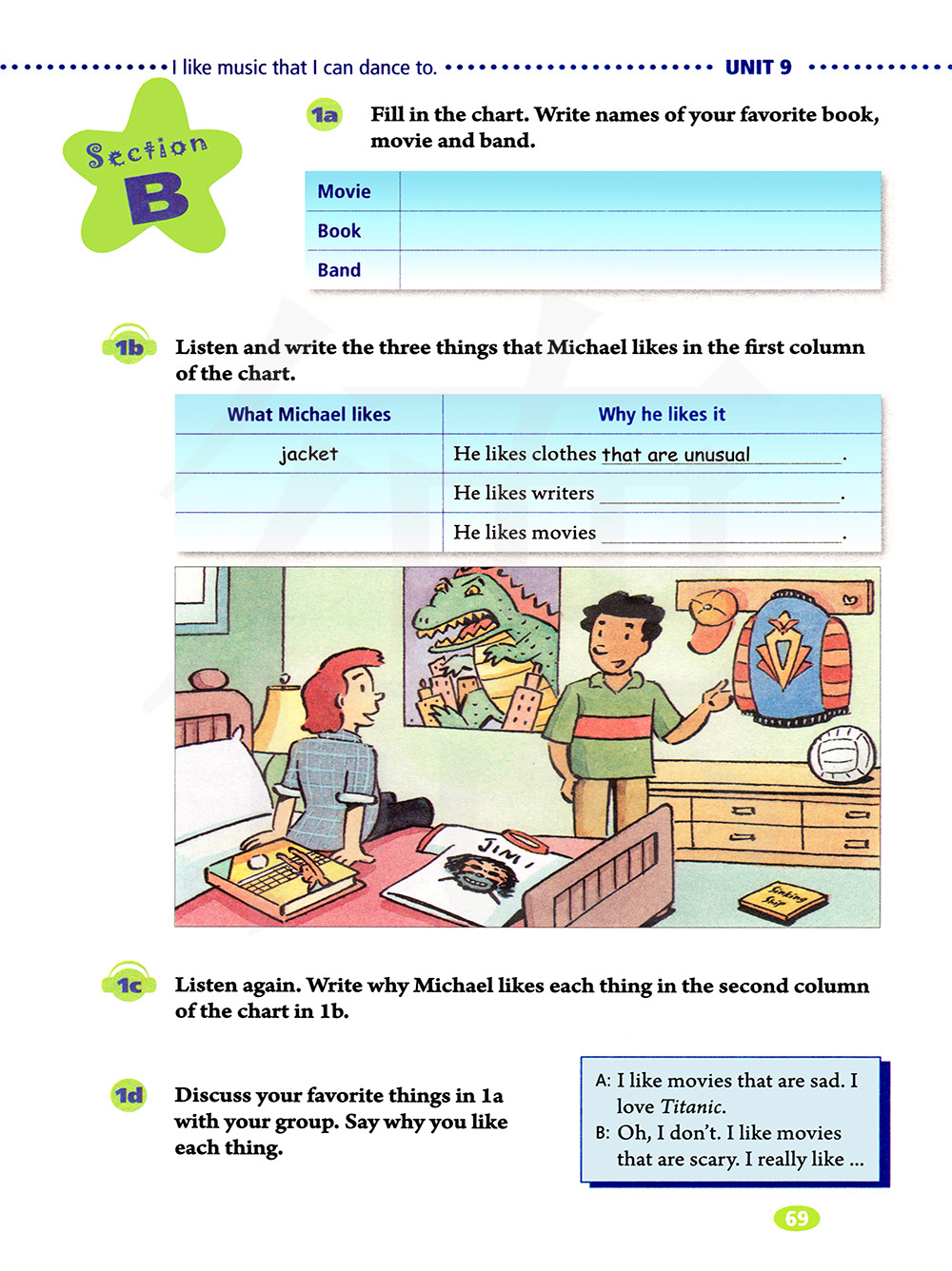 再听一遍,在1b的表格中的第二栏写下迈克尔喜欢每样东西的原因