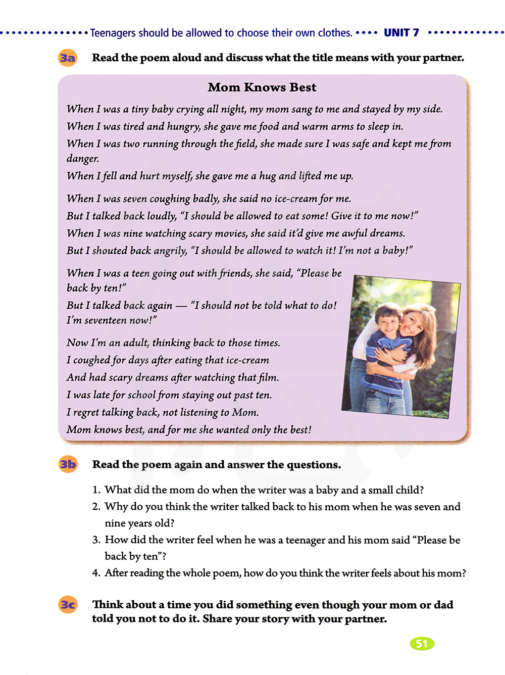 当作者还是一个小宝宝和小孩子的时候,妈妈是怎么做的? 你认为当作者七岁和九岁的时候,他为什么要和妈妈顶嘴?