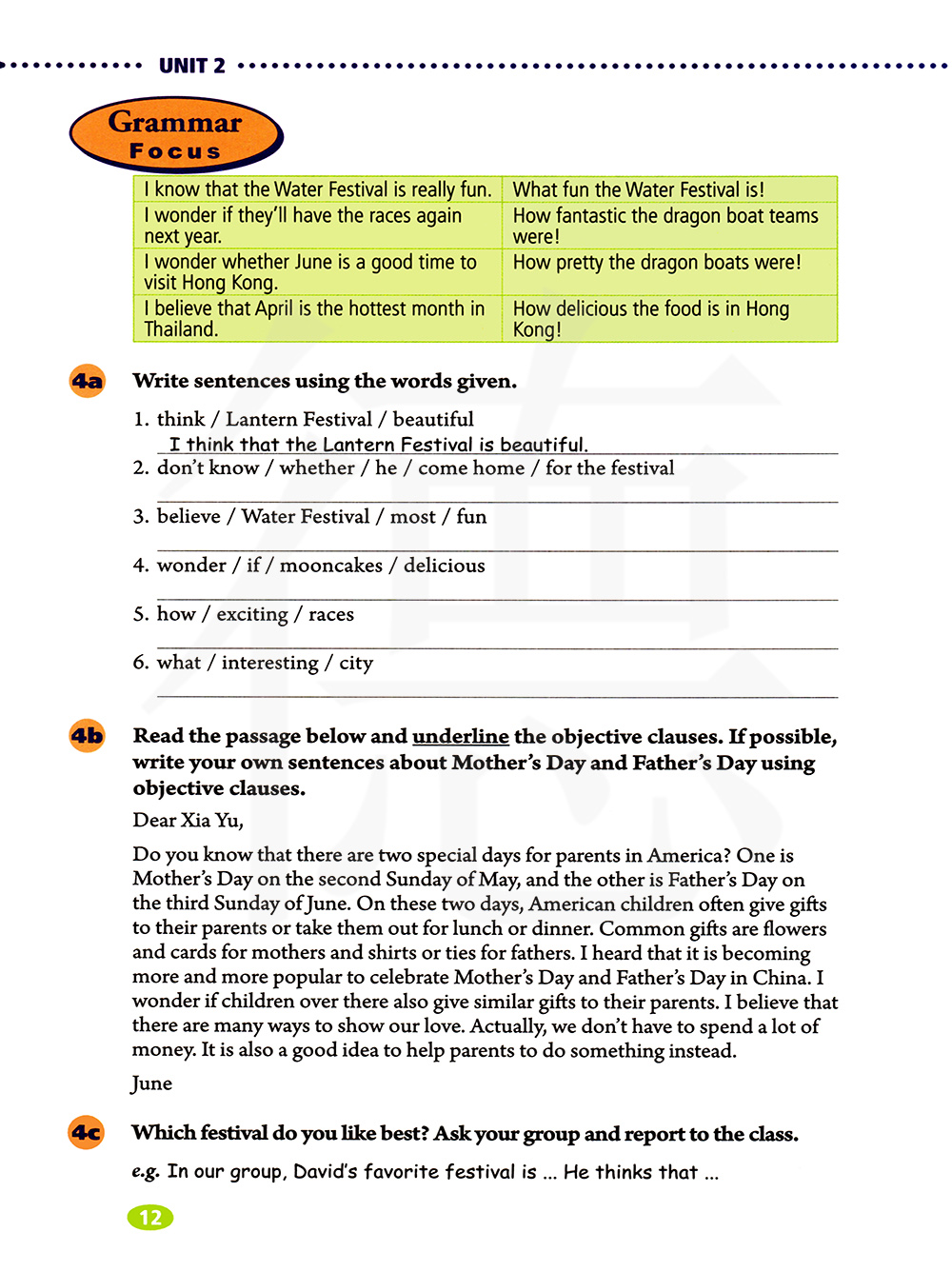 阅读下面的这篇文章并在宾语从句下面划线,如果有可能,用宾语从句就父亲节和母亲节写出你自己的句子。