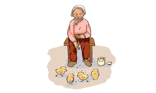 我爷爷每天喂小鸡。