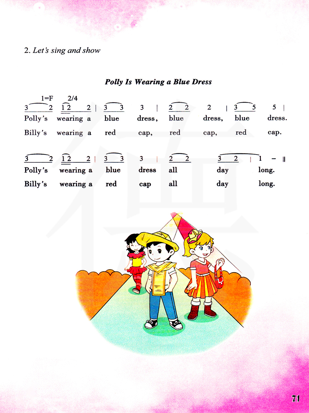 菠莉穿着一件蓝色的连衣裙,蓝色的连衣裙,蓝色的连衣裙。菠莉一整天都穿着一件蓝色的连衣裙。比利 戴着一顶红色的帽子,红色的帽子,红色的帽子。比利一整天都戴着一顶红色的帽子。