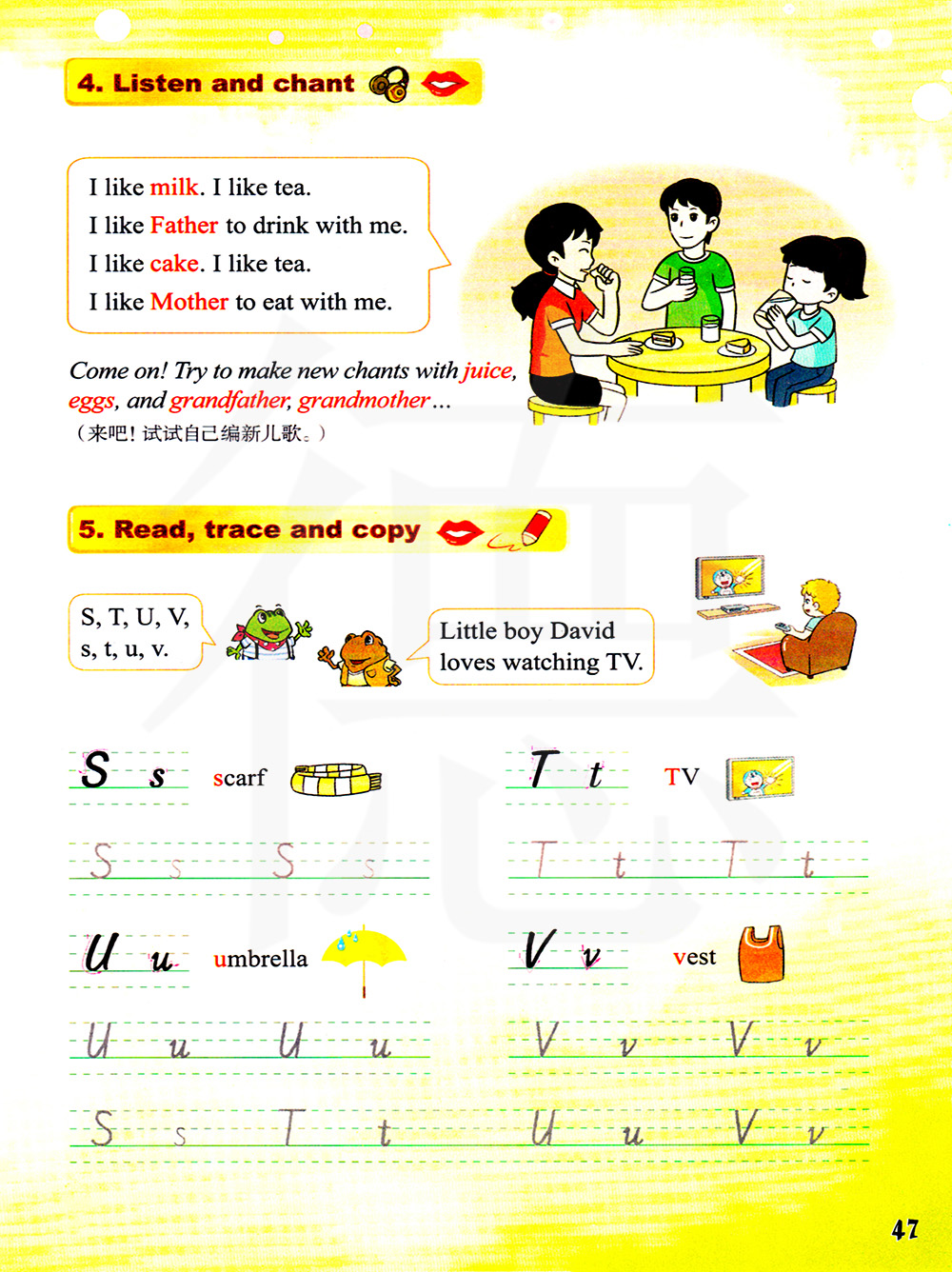 来吧!用juice,eggs和grandfather,grandmother....试着编新歌。