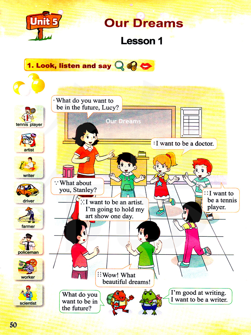 1.能听得懂、会说、会读和会拼写dream, future, scientist, artist, take care of,。