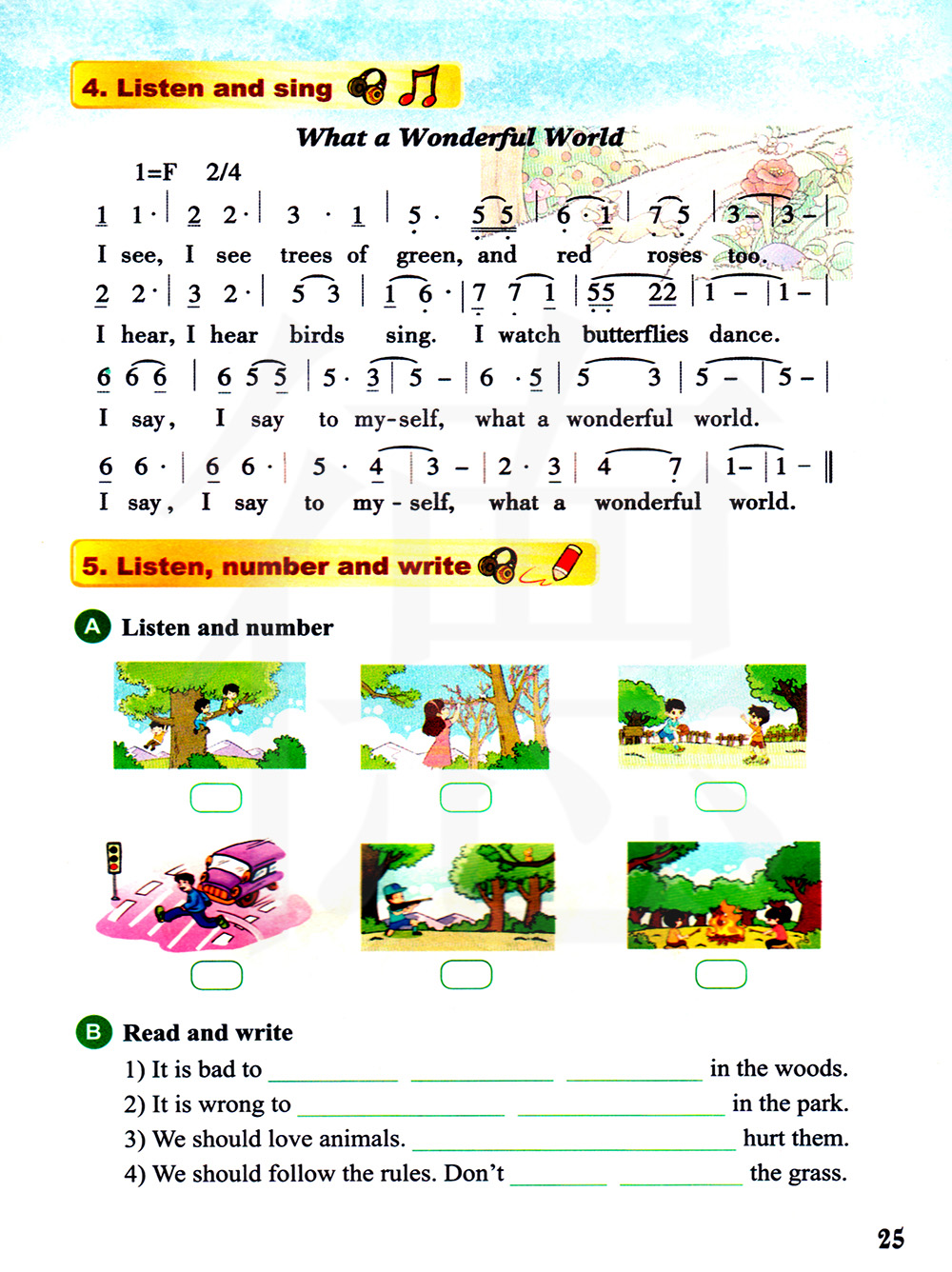 我看见,我看见绿色的数木,也看见红色的玫瑰。我听见,我听见鸟在唱歌。我看见蝴蝶在跳舞。我说,我对我自己说,多么美好的世界啊。我说,我对我自己说,多么美好 的世界啊。