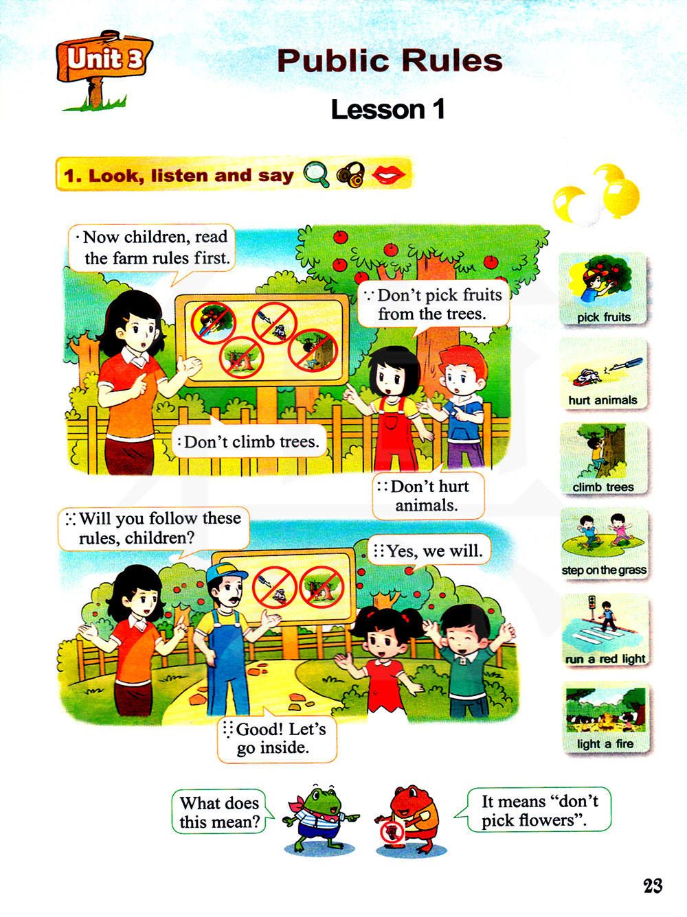 1)学生通过自学解决新单词(shoot、pick、light、hurt、cut)的发音及含义。2)学生能够看图标,用“don?t……”介绍图标的含义。3)流利的完成课文对话