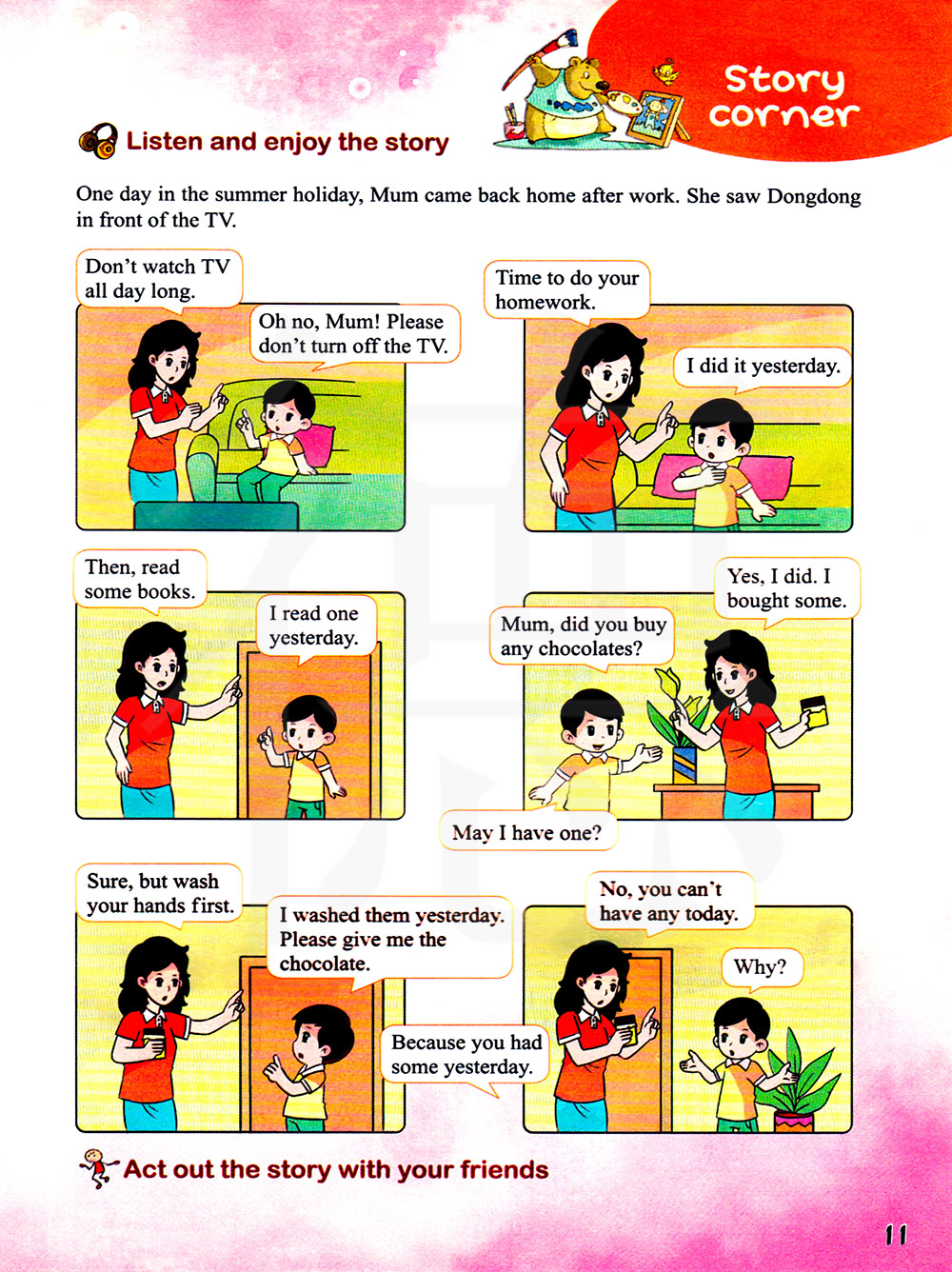 暑假的一天,妈妈工作回来。她看见东东在电视机前面。