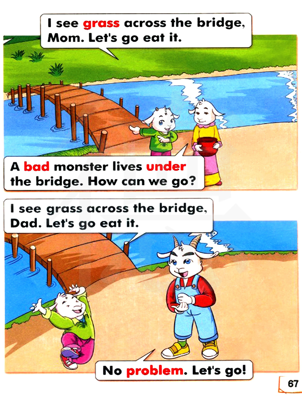 我看见桥对面有草,爸爸。我们去吃吧。