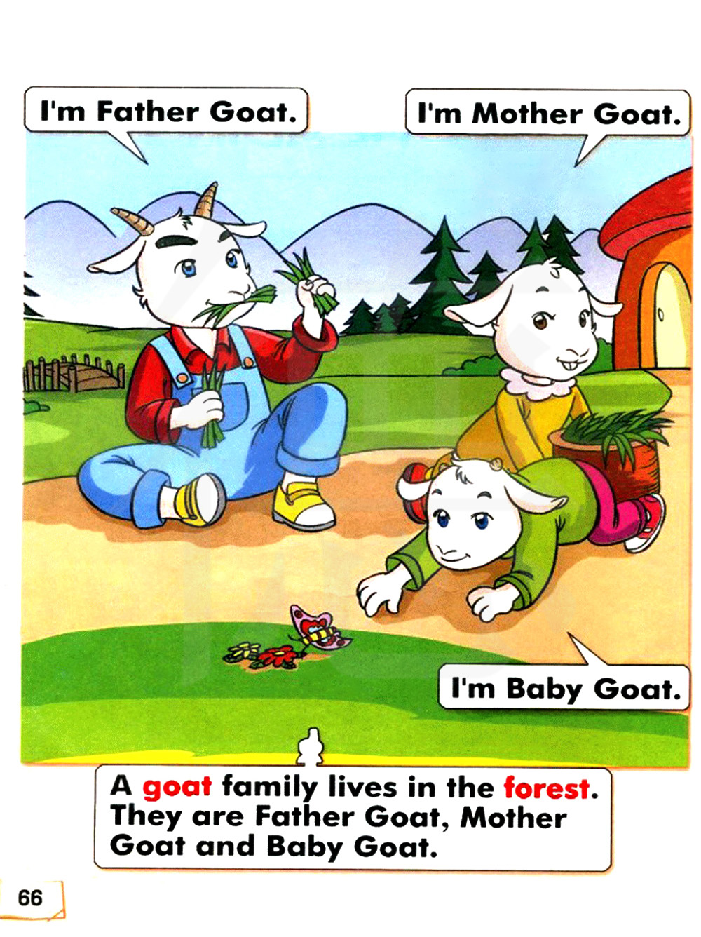 一个山羊家庭住在森林里。它们是山羊爸爸、山羊妈妈和山羊宝宝。